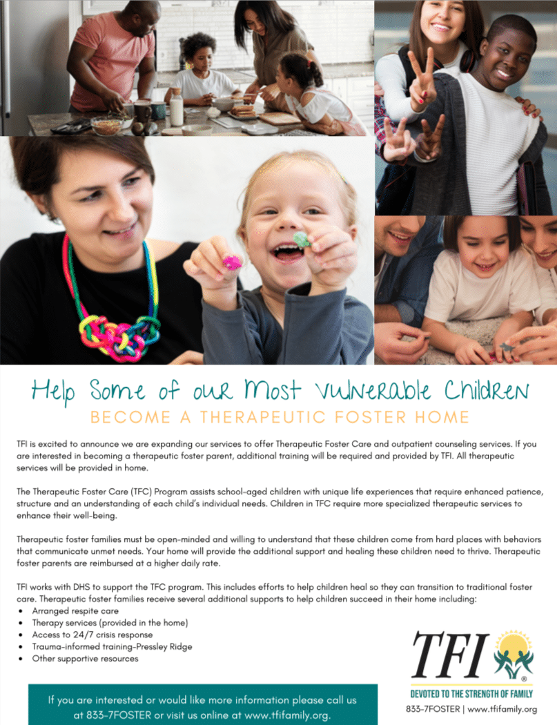To learn more about becoming a Therapeutic Foster Care Family, talk to your Foster Care Worker.